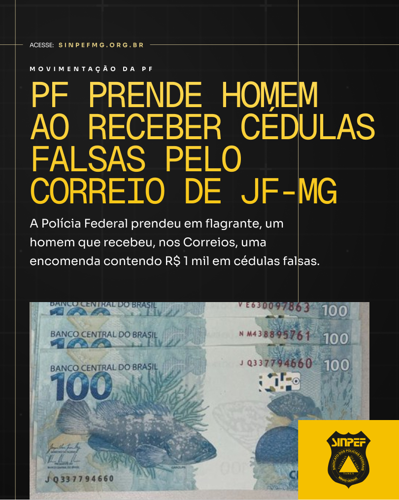 A Polícia Federal prendeu em flagrante, nesta quinta-feira (2/10), um homem que recebeu, nos Correios, uma encomenda contendo R$ 1 mil em cédulas falsas. A ação ocorreu no Centro de Distribuição Domiciliar Juiz de Fora Norte/MG.